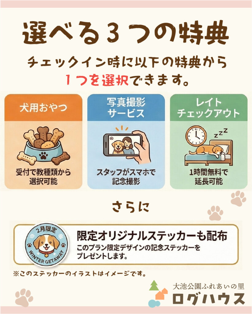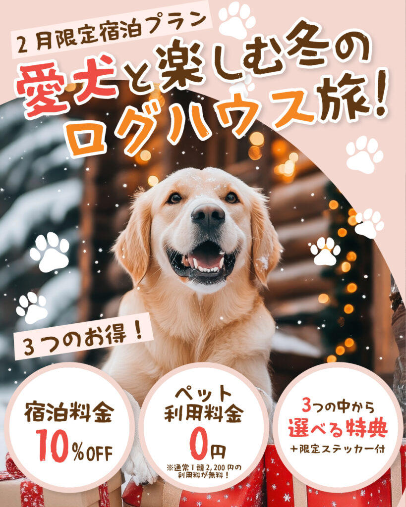 【2月限定】愛犬と楽しむ冬のログハウス旅♪ 宿泊料金10%OFF+ペット料金0円+選べる特典付き!